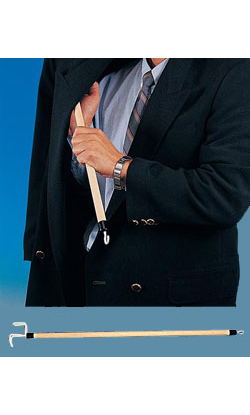 Простое устройство для облегчения одевания рубашки в виде деревянной рукоятки с большим пластиковым крюком формы C с одной стороны и специальным захватом с другой стороны.