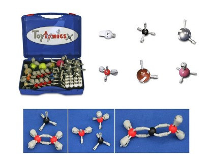Набор состоит из моделей атомов разных веществ двух диаметров (3 и 6 сантиметров). Модели атомов имеют соединительные элементы, равные валентности атомов.